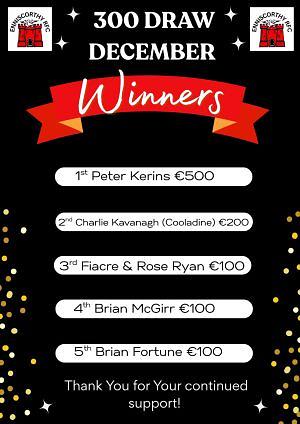 1st - 173 - Peter Kerins €500 2nd - 159 - Charlie Kavanagh (Cooladine) €200 3rd - 258 - Fiacre & Rose Ryan €100 4th - 195 - Brian McGirr €100 5th - 110 - Brian Fortune €100 Link to watch draw