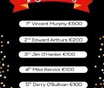 1st - 219 - Vincent Murphy €500 2nd - 4 - Edward Arthurs €200 3rd - 229 - Jim O'Hanlon €100 4th - 178 - Mike Kerwick €100 5th - 227 - Derry O'Sullivan €100 Link to watch draw