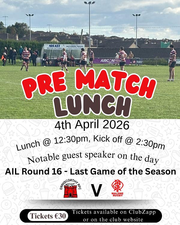 End the season in style and Join Club President Liam Spratt for a pre-match lunch ahead of our Malone game at 12.30 on April 4th with a keynote guest speaker. Price includes match ticket. Limited places available.